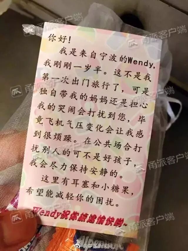 “我是来自宁波的Wendy,我刚刚一岁半……独自带我的妈妈担心我的哭闹会打扰到您,这里有耳塞和小糖果,希望能减轻你的困扰……”
