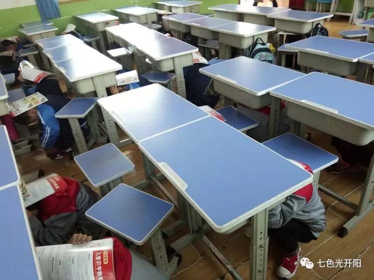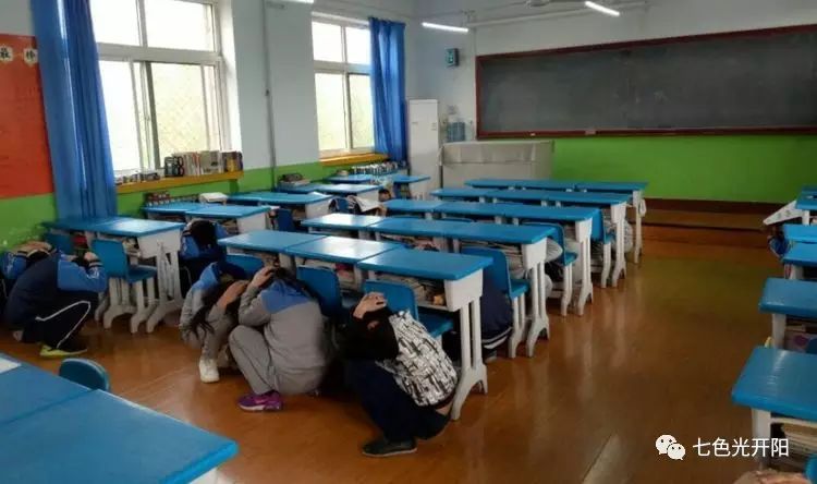 地震警报声响起,孩子们在老师的组织下,有序地在班级里进行躲避。