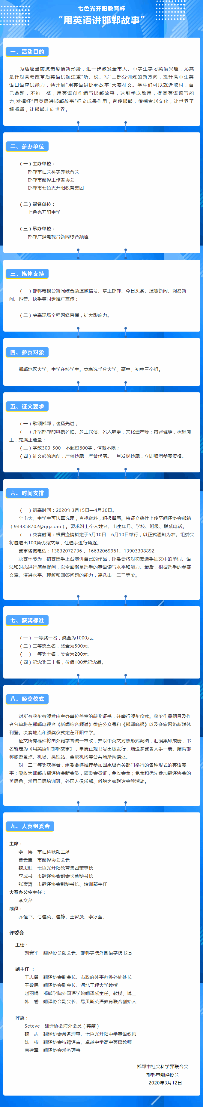 “七色光开阳教育杯‘用英语讲邯郸故事’”大赛征文开始啦!大赛分初赛和决赛两个阶段。初赛是征文评选入围,决赛是入围者在现场演讲和答评委提问。