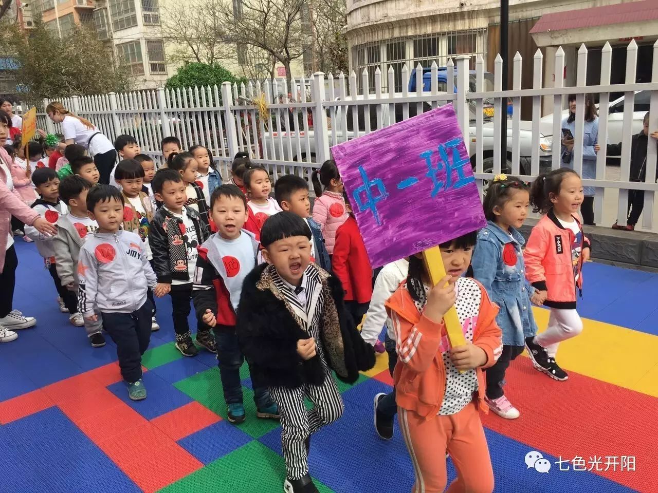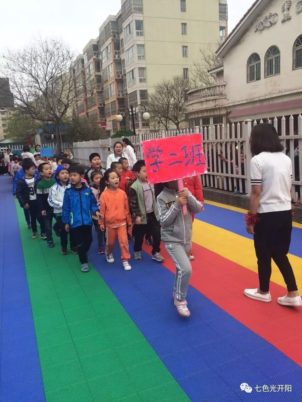 欢快活泼的教师开场舞之后,运动会正式开始。孩子们喊着嘹亮的口号,踏着整齐的步伐,步入赛场。